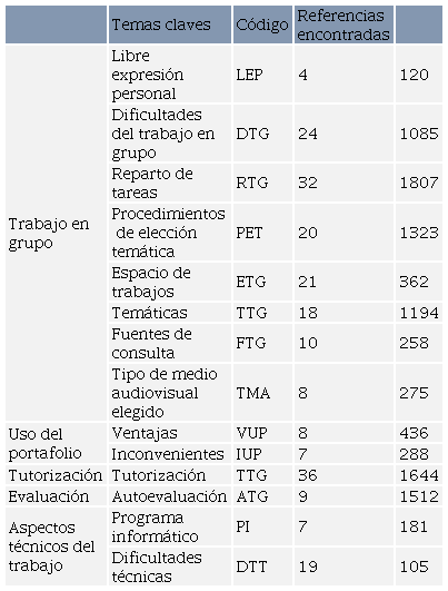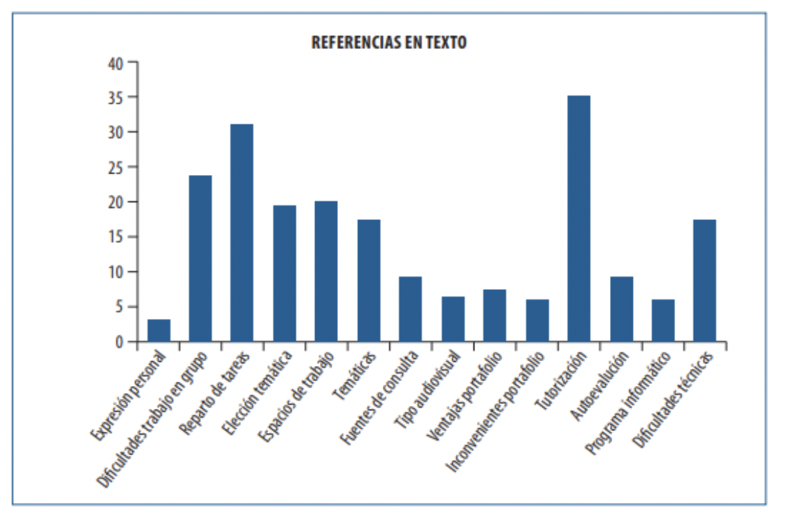 En este apartado, en el gráfico 1, se exponen los resultados obtenidos, en función del número de informes encontradas en el texto. El tema que muestra más referencias se relaciona con el proceso de tutorización seguido a la hora de realizar el trabajo del medio audiovisual, con 36 referencias. Es decir, con respecto al trabajo realizado, a lo que los estudiantes han dado mayor importancia es a la comunicación y retroalimentación que han ido teniendo con el profesor de la materia. Como se constata en algunas de las referencias expuestas en la tabla 9. En este sentido, coincidimos con Bozu e Imbernón (en prensa) en que el portafolio es una estrategia que permite al docente conocer, a través del análisis realizado sobre la propia práctica docente, cuáles son los puntos fuertes y los puntos débiles que hay que mejorar a corto plazo acerca de los contenidos que en el aula se trabajan, de la metodología utilizada, los recursos didácticos, etc.