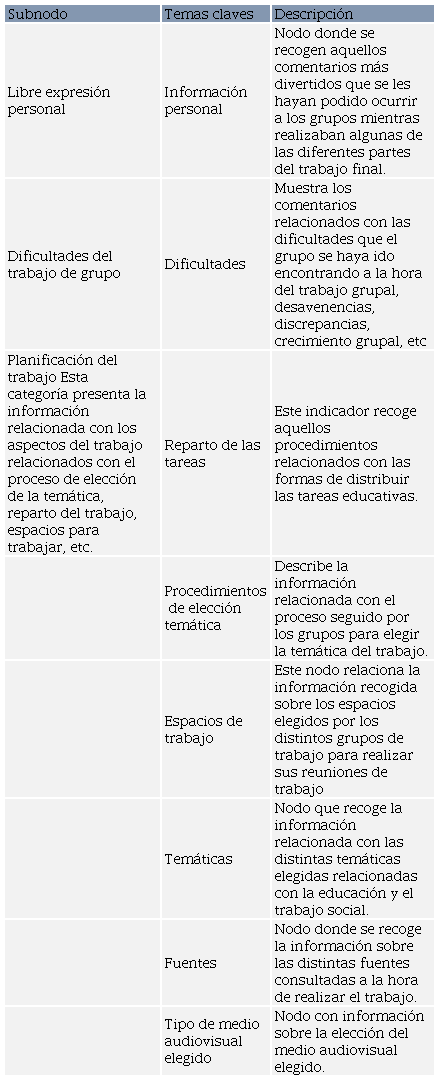 Para continuar con el estudio se agrupa cada una de las categorías que componen el trabajo. El primer nodo se denomina trabajo grupal, este enfoque didáctico se centra en trabajo en equipo, tareas relativas con la planificación del proyecto didáctico multimedia, historietas, anécdotas, problemas, etc. (tabla 3)