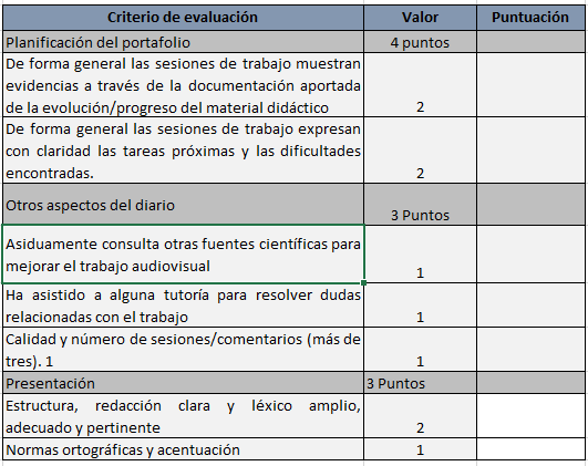 Con relación a la matriz de valoración del portafolio electrónico, Autores como Tillema y Smith (2007), consideran que puede realizarse de muchas formas y a través de una diversidad de métodos. En este sentido, se fundamentó en una revisión de la literatura científica (Barrett, 2000; Klenowski, 2005; Barberà, 2008; entre otros) y en las competencias implicadas en la elaboración del portafolio que dio lugar a la rúbrica que se muestra en la tabla 2.