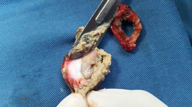 Bajo anestesia regional epidural en posición decúbito dorsal previa asepsia y antisepsia, colocado los campos estriles, se realizó una incisión semilunar infra umbilical de 5 cms. Se profundiza los planos se localiza una tumoración que al tacto es semidura, fija, adherida a la cicatriz umbilical y a la fascia aponeurótica por lo que se procede a la resección de la cicatriz umbilical incluyendo piel en una incisión en hoja de laurel transversal de 4 x 3 cms, se resecó la tumoración de la aponeurosis que se retiró y se pudo observar el defecto herniario libre. Se reparó el orificio con la técnica de mayo modificada, se fijó aponeurosis a la piel abdominal para formar una nueva cicatriz umbilical por estética, se procedió a cerrar la herida por planos.
