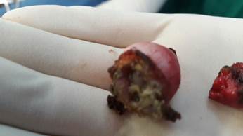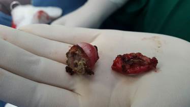 Se procedió a incidir la tumoración quística de 5 cms por 4 cms de superficie lisa, color amarillo grisáceo se observa las capas fibrosas, gruesa y en su interior había contenido sebáceo.