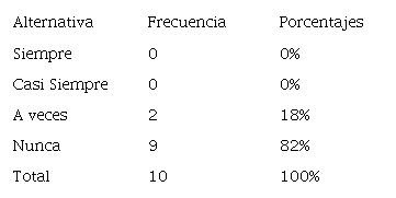 82% de los asistentes dijo que nunca se generan ejercicios de estimulación a los adultos mayores, lo que hace replantearse la implementación de estos talleres para los adultos mayores.