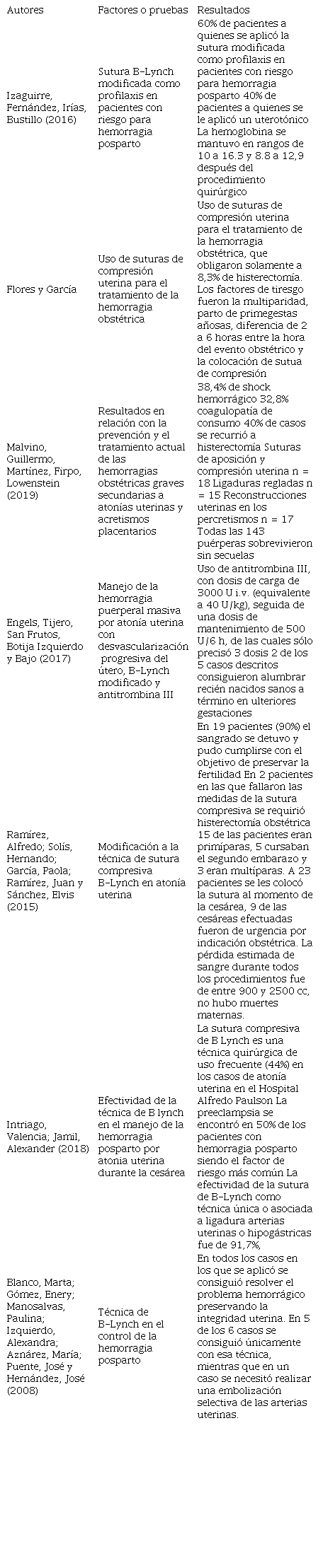 En consecuencia, el principal resultado obtenido es que, la aplicación de la técnica de sutura B-Lynch de compresión uterina, demostró en la mayoría de los estudios referentes seleccionados, su eficacia en el enfrentamiento de la hemorragia uterina, evitando la mortalidad materna en todos los casos.