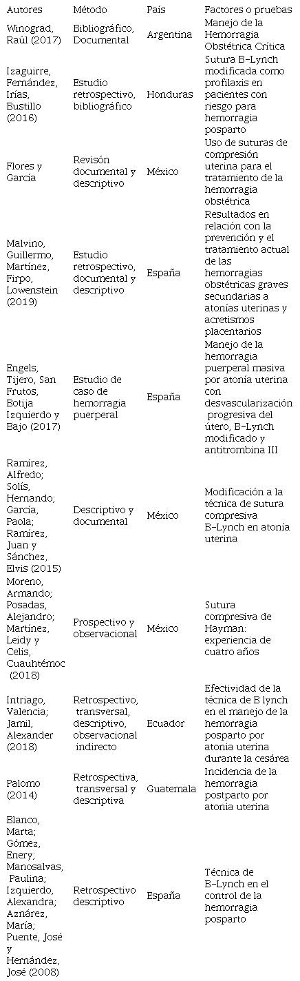 El artículo que tiene como objetivo la descripción de la técnica de -Lynch de compresión uterina y su aporte en el nfrentamiento de la hemorragia pos cesárea, tiene su base fundamental en la revisión bibliográfica de ciertas publicaciones nacionales e internacionales que fueron seleccionados con base en la búsqueda en revistas y espacios cibernéticos científicos prestigiosas como Scielo, Elsevier, entre los más relevantes.
