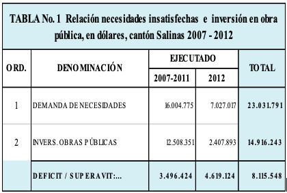 Hace más de una década que la población del cantón Salinas, no es atendida por sus gobernantes con inversiones en obras públicas relevantes, sus necesidades se interpretan claramente en la tabla de datos. En el año 2007 se demandaron necesidades por $2?172.206 en obra pública, los registros presupuestarios indican que se pagó por este concepto $1?354.350, existiendo un déficit de 817.816. En el año 2008 las necesidades tuvieron un costo de 2?043.948, se registraron pagos por 2?073.606, la diferencia se debe a ajustes de valores, es decir que el 100 % de lo planificado se ejecutó.
