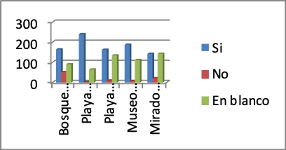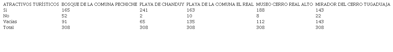 Esta variable registra los atractivos turísticos que las personas estarían dispuestas a visitar, indicando que 165 (53.57%) personas visitarían el Bosque de la Comuna Pechiche; 241 (78.25%) personas visitaría la Playa de Chanduy; 163 (52.92%) visitaría la Playa de la Comuna El Real; 188 (61.04%) visitaría el Museo Cerro Real Alto frente a 143 (46.43%) personas irían al Mirador del Cerro Tugaduaja.