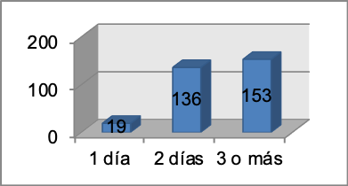 A las personas se les preguntó el número de días que permanecerían hospedados en el complejo, la variable que recopila esta información es tiempo de permanencia. En el Gráfico 17 se visualiza el tiempo (días), que los consultados permanecerían hospedados en el complejo de estudio, dichos porcentajes corresponden al 49.68% se hospedaría 3 o más días el 44.16% se hospedaría 2 días y el 6.17% se hospedaría 1 día.