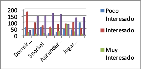 La información acerca de las actividades que estarían interesados en realizar los encuestados se visualiza los respectivos porcentajes para cada actividad en los cuales el 66.5% de las personas desearía dormir en casa de una familia de la comunidad; el 35.7% de las personas desearía pescar; el 30.2% desearía practicar Snorkel; el 39% desearía probar la comida típica, el 39% manifiesta que aprendería a preparar la comida típica, mientras que el 56.8% estaría dispuesto a realizar una caminata por el sector, el 41.6% practicaría futbol o vóley con los lugareños, finalmente el 22.7% realizaría actividades de agricultura de la zona.