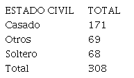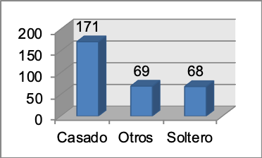 Esta variable registra el estado civil de la persona a la cual se entrevistó, de estas frecuencias se destaca que 171 (55.5%) de los entrevistados tiene por estado civil el de casado.