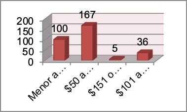 En el Gráfico 8 se muestran los porcentajes de los consultados que seleccionaron los respectivos intervalos de dinero dispuestos a gastar aproximadamente en un día. Arrojando como resultados que el 54.2% prefiere gastar en un rango de $50 a $ 100.