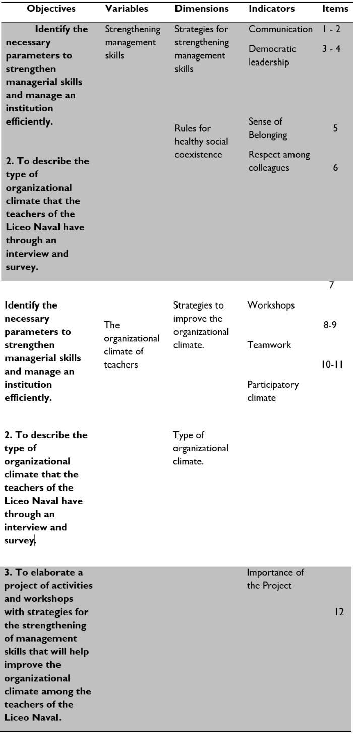 The selection and design of the observation instrument within the framework of the aforementioned project is based on the recognized performance that scale-type questionnaires have shown from different research experiences. Clearly defined organizational goals and objectives, if worked on in an adequate environment, help the organizational climate, as we discovered in the surveys, provided that the leadership applied is favorable and assertive. Therefore, it was determined that by improving management skills at the Liceo Naval School, the organizational climate among the teachers of the institution also improves.