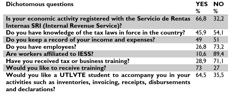 Another point is the answers to the dichotomous questions (Table 1); regarding the economic activity registered with the Internal Revenue Service (SRI) 66.8% said Yes and 32.2% said No; in the case of knowledge of the tax laws in force in the country, 45.9% said Yes and 54.1% said No; hence, those who said they keep their income and expenditure records 49% said Yes and 51% said No; therefore, those who have workers 26.8% said Yes and 73.2% said No; considering those who indicate that they have workers affiliated to the Ecuadorian Institute of Social Security (IESS), 10.6% said Yesand 89.4% said No; as shown in the table, 28.9% said Yes and 71.1% said No; as shown in the table, have they received training in tax or business matters? 73% said that they would like to receive training and 27% said Yes and 27% said No; they would also like a UTLVTE student to accompany them in their activities such as inventories, invoicing, income, expenses and declarations. 64.5% said Yes and 35.5% said table 1