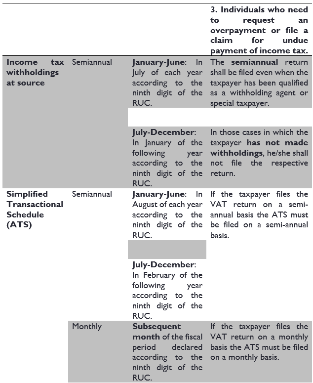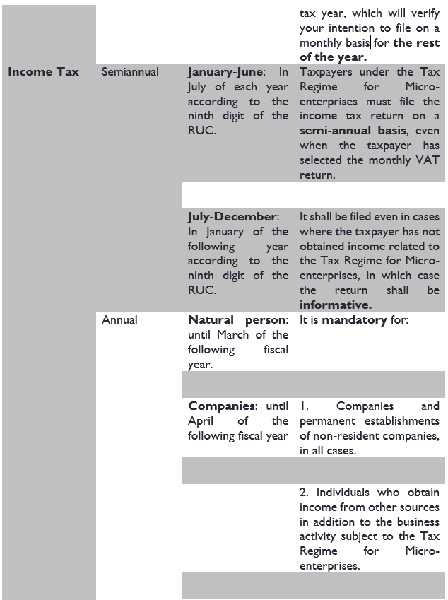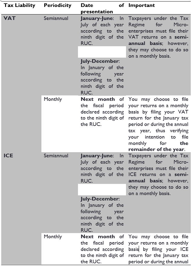As stated (SRI, 2020) the Tax Regime for Micro-companies applies to income, value added and special consumption taxes, therefore, taxes not defined for this regime must be declared in the form and means defined by the corresponding tax law and its implementing regulations. The following is a summary of the form of filing tax obligations for taxpayers subject to the tax regime for micro-enterprises: