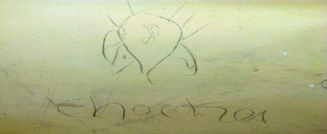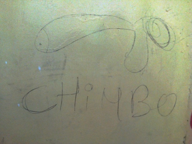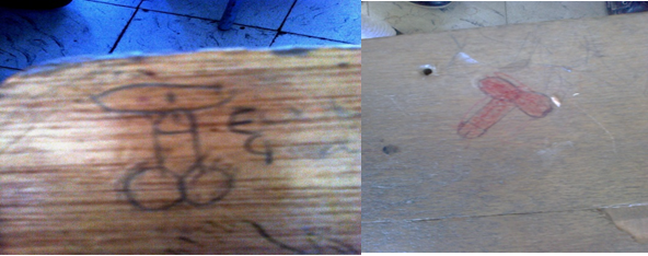 ¿Concha? Nooo… chocha... ah… es una vagina y la tiene peluda, es la verdad mire que eso dice. Puede ser de un estudiante que nunca ha estado con otra persona y así demuestra que tiene ganas de otra… como obsesionado por tener sexo… podría ser también que una de ellas quiere manifestar que se siente más mujer y quiere demostrarlo pintando sus genitales.