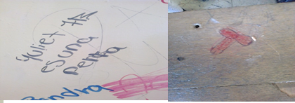 Ahora bien, la escuela como escenario social y cultural, no ha sido ajena a este tipo de manifestaciones, pues, de igual manera, en diferentes lugares del espacio educativo -paredes, sillas, puertas y otros-, es posible encontrar diversidad de trazos realizados por los estudiantes, aun cuando estas prácticas son prohibidas por las directivas de las instituciones.