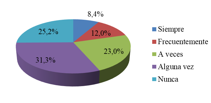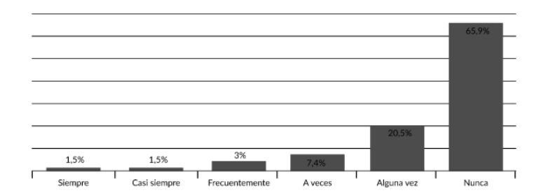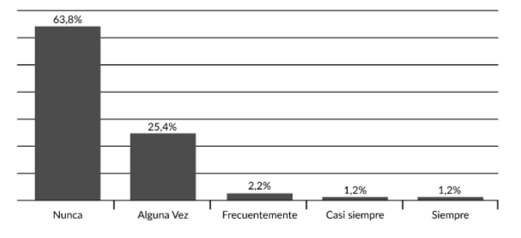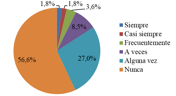La mayoría de los alumnos encuestados contestan que nunca han agredido a ningún compañero del centro. También se contempla la opción en una minoría de la muestra de la existencia de casos que frecuentemente, siempre o casi siempre agreden a sus compañeros (Figura 8).