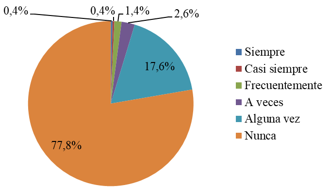 Existe una amplia muestra que dice presenciar, alguna vez, la agresión física a algún compañero del centro, pese a que la mayoría contesta con nunca haber visto dichas agresiones. Resulta muy significativo los datos sobre los alumnos que afirman haber sufrido agresiones físicas siendo un 1,2% siempre o casi siempre, un 1,8% frecuentemente, un 4,6% a veces, un 19,6% alguna vez y, por último, un 72,8% nunca (figura 7).