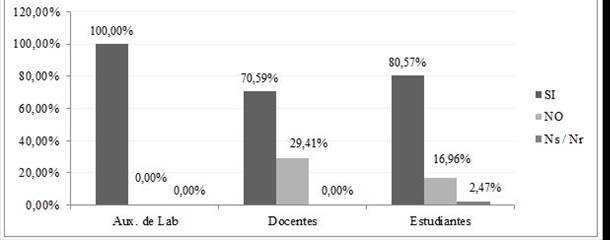 Por otro lado, aunque la totalidad de los auxiliares encuestados dice conocer los protocolos usados en la UMB para la disposición de los residuos químicos peligrosos, considerando que así la Institución promueve la cultura de protección del medio ambiente mediante un Plan de gestión integral de residuos químicos peligrosos, el 12,5 % informó que no maneja protocolos para la manipulación, desactivación y el desecho de los residuos peligrosos, frente al 87,5 % que sí lo hace.