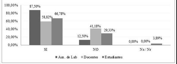 Se observa, entonces, que sí existe un conocimiento del Plan de gestión integral de residuos químicos peligrosos, y que el trabajo desarrollado cada semestre dentro de las prácticas de laboratorio, ha reforzado este saber, lo cual implica una cultura de prevención y manejo de los residuos químicos peligrosos. El 59,01 % sabe que la UMB, sede Bogotá, cuenta con un Plan de gestión integral de residuos químicos peligrosos, el 39,22 % manifiesta no saberlo y el 1,77 % no sabe o no responde. Así mismo, el 82,33 % considera que las guías de laboratorio manejadas, generan herramientas para conocer dónde desechar los residuos químicos generados en la práctica, el 16,61 % no lo considera así y el 1,06 %, no sabe o no responde. En concordancia, el 80,57 % considera que la Universidad promueve la cultura de protección del medio ambiente mediante un plan de gestión integral de residuos químicos peligrosos, frente al 16,96 % que respondió negativamente, y al 2,47 % que no sabe o no responde.