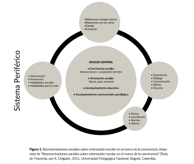 Para visualizar lo analizado, es preciso compilar toda esta caracterización en una breve síntesis gráfica, que refleja los componentes periféricos y el núcleo central de la representación social en orientación escolar dentro del marco de convivencia (véase figura 1).
