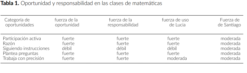 El análisis de la aceptación de estas oportunidades por los estudiantes focales indicó diferencias en la participación en el aula. Lucía participó activamente en las prácticas matemáticas del aula, tanto en las discusiones de toda la clase como en el trabajo en grupos pequeños. Ella razonó a través de problemas matemáticos y planteó preguntas de significado para sus compañeros de equipo y el docente. Ella también se responsabilizó a sí misma y a su grupo de estas prácticas. A pesar de este fuerte compromiso, Lucía a veces se esforzaba por trabajar con precisión con los conceptos y procedimientos matemáticos. Esto no le impidió probar sus ideas matemáticas con otros y participar activamente en las prácticas de la clase. Santiago no tomó las prácticas en su aula de matemáticas en misma proporción en que lo hizo Lucía. Su aceptación de las oportunidades para razonar matemáticamente, plantear preguntas y participar activamente fue moderada. Tuvo dificultad para mantenerse concentrado en la clase, a menudo mirando hacia el espacio durante minutos, incluso en un trabajo de grupo que implicaba un alto compromiso. A diferencia de Lucía, sin embargo, Santiago tendía a llegar a respuestas correctas cuando se dedicaba a explicar, justificar y refinar sus ideas con los miembros de su grupo.