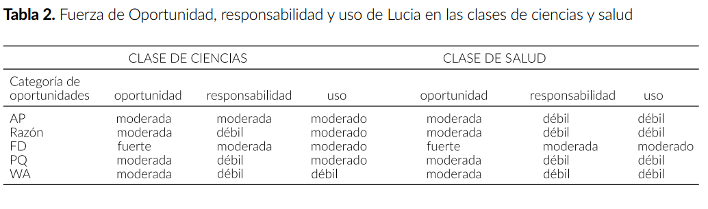 Otras clases: Lucia. El compromiso de Lucía en las clases de salud y ciencias era muy diferente de su compromiso en las clases de matemáticas. Las oportunidades para que razonara sobre el contenido eran generalmente moderadas, y rara vez se le hacía responsable ( tabla 2). Su participación tendía a coincidir con la fuerza de estas oportunidades.