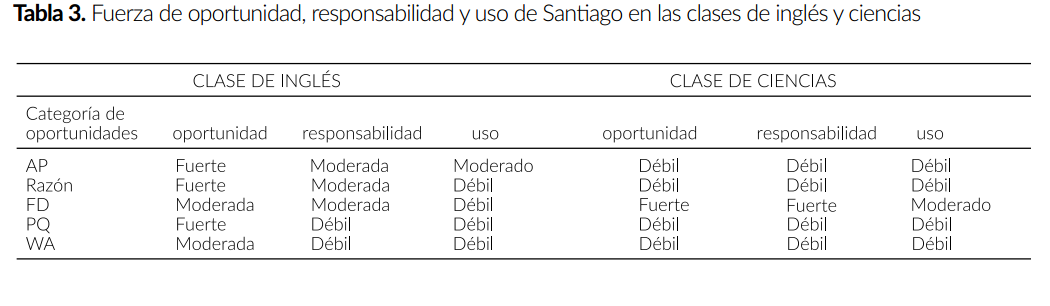 De todas las clases observadas en el estudio, la clase de ciencia de Santiago tuvo las oportunidades más débiles para participar en la investigación y las oportunidades más fuertes para seguir instrucciones. Esta situación era altamente problemática para Santiago, que no hacía el trabajo de asiento individual que se le daba, y lo peor era que a menudo fue reprendido por el profesor por no estar preparado, ni prestar atención o interrumpir activamente la clase con sus comentarios humorísticos. Así, la identidad que él negoció en esta clase era como un estudiante resistente que era incapaz de comprender el material.
