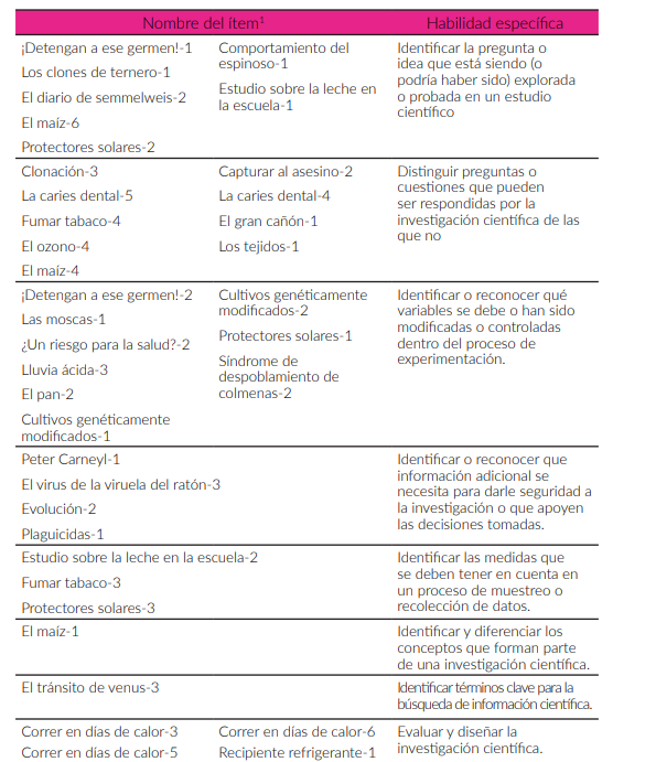 Aunque cada ítem puede ser clasificado desde el punto de vista de cada dimensión que lo conforma, solo se abordará su clasificación según las tres competencias científicas, dándole prioridad al reconocimiento de las habilidades específicas con las cuales puede trabajar el docente en el aula