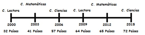Las pruebas internacionales PISA (Programme for Internacional Student Assessment), es el programa para la evaluación internacional de alumnos a cargo de la Organización para la Cooperación y Desarrollo Económico (OCDE), a través de la cual se evalúa a estudiantes de 15 años de edad de más de 70 países del mundo en tres áreas del conocimiento: lectura, matemáticas y ciencias, con el fin de generar indicadores de rendimiento que lleven a definir fórmulas de políticas educativas de largo alcance que afecten en el mejoramiento de los sistemas educativos. Estas pruebas iniciaron en el año 2000 y se ejecutan con una regularidad trianual, dándole mayor profundidad a una de las áreas en cada período, según se muestra en la Figura1.
