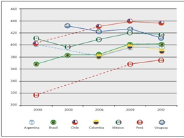 Colombia hace parte de estas pruebas desde el año 2006 como país asociado, participando hasta el momento en 4 versiones de PISA: 2006, 2009, 2012 y 2015. De esta última todavía no se publican resultados; sin embargo, en las tres anteriores ha tenido una participación muy sombría, siendo siempre el penúltimo de la lista de países participantes, de tal manera que el rendimiento de los estudiantes colombianos se ubica en los niveles más bajos de estas pruebas, considerándose que sus aportes serán mínimos a la sociedad del futuro (Castelblanco, 2008), superando solo a Perú el cual ha venido mejorando en comparación a Colombia según la investigación de Rivas (2015) lo que se puede visibilizar en la Figura2.