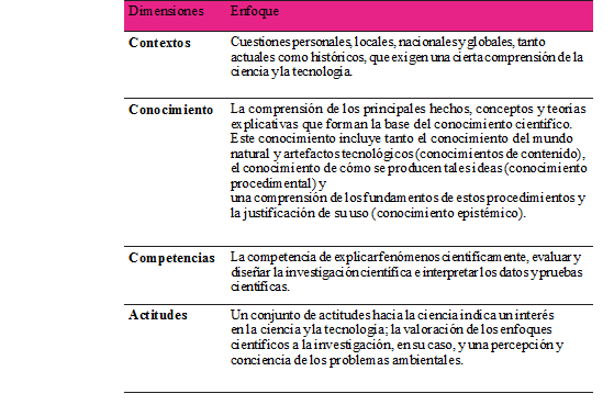 Este concepto ha venido siendo refinado desde el propuesto por la OCDE en 1999, que postula que una persona científicamente alfabetizada debe tener la “competencia de utilizar los conocimientos y habilidades científicas, no solo para entender el mundo natural sino también para intervenir y ayudar en la toma de decisiones que lo afectan y los cambios que se han generado por la actividad humana” (OECD 1999, 2003, 2006, 2015, 2016). Para este propósito, PISA 2015 retoma este principio básico y lo enriquece basándolo en 4 dimensiones interrelacionadas (Ver tabla1),de las cuales las tres primeras tienen sus orígenes en PISA 2000 y la última nace con la prueba de 2006.