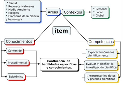 De esta manera, desde PISA 2000, se propone que los conceptos que se trabajarán serán familiares a las áreas comunes de la ciencia como son la física, la química, las ciencias biológicas y ciencias de la tierra y el espacio, que no solamente tendrán que recordarse sino aplicarse en cada uno de los ítems (OECD, 1999), apuntándole siempre a losniveles más altos de la alfabetización científica (Bybee, 1997) y de las dimisiones cognitivas del aprendizaje (Bloom, 1956; Gallardo et al., 2010).