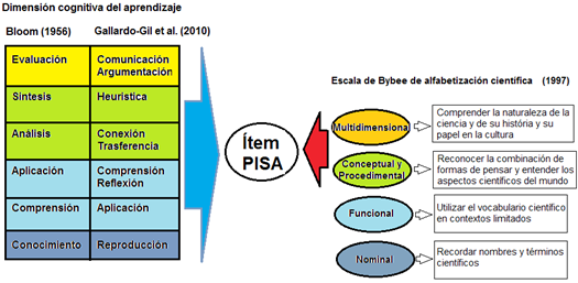 Teniendo en cuenta estas denominaciones, ya sea desde los niveles de Bloom (1956) o la escala de Bybee (1997), lo que se busca es alcanzar los niveles más altos del conocimiento y alfabetización científica. Aunque Gallardo-Gil et al. (2010), menciona que los ítems PISA prestan poca atención a los niveles más altos debido a los pocos ejemplos encontrados, también es cierto que los casos con niveles bajos son escasos, concentrándose la mayoría de los ítems en evaluar los niveles medios de la dimensión cognitiva, como son la aplicación, comprensión/reflexión y conexión/trasferencia.