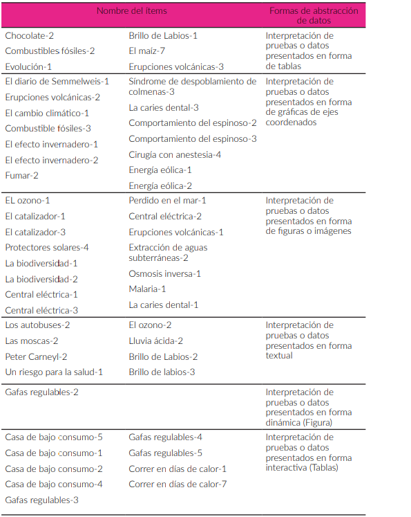 De esta manera, se presentan como parte de esta competencia 53 ítems PISA de los cuales, 29 presentan un formato de elección múltiple, 4 con formato de elección múltiple compleja, 19 ítems presentan formato de respuesta abierta y 1 de formato cerrado. En la tabla 3 se listan los ítems categorizados según las diferentes formas de abstracción de los datos, presentando una gran variedad de ejemplos para que el docente visibilice su importancia dentro del proceso de formación del estudiante y que son complementarios al proceso de investigación.