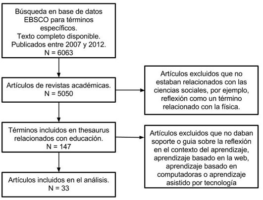 Los recursos y bases de datos a los cuales se accedió a través del motor de búsqueda EBSCO fueron Academic Search Complete, revistas electrónicas, ERIC, PsycARTICLES, PsycINFO y el Centro de Referencia de Maestros. El texto de los articulos y palabras relacionadas fueron buscadas usando las palabras clave. El texto completo de un artículo debía estar disponible para su inclusión. El objetivo era estudiar sólo los últimos artículos, Por lo que se eligió un plazo estricto y sólo se realizaron búsquedas en los artículos publicados en los últimos seis años (2007-2012). La búsqueda fue limitada al incluir sólo artículos publicados en revistas académicas. Los artículos no relacionados con la educación, como los que usan el término “reflexión” en el contexto de la física (basado en los términos de thesaurus utilizados en la base de datos) fueron excluidos. Los términos seleccionados de thesaurus fueron: ambiente de aprendizaje, aprendizaje, instrucción asistida por ordenador, desarrollo profesional, enseñanza, métodos de enseñanza, tecnología, formación de profesores, actitudes de los estudiantes, profesores, supervisión profesional, diferencias culturales, toma de decisiones, Internet, maestros, educación, liderazgo, maestros de pre-servicio, resolución de problemas, psicología, auto concepto, actitudes de los maestros, comunicación escrita, programas educativos, evaluación, educación superior, desarrollo, tecnología de la información, nivel cognitivo, lenguaje, significado, motivación, aprendizaje autorregulado, estudiante, el compromiso, el pensamiento y el desarrollo de los adolescentes.