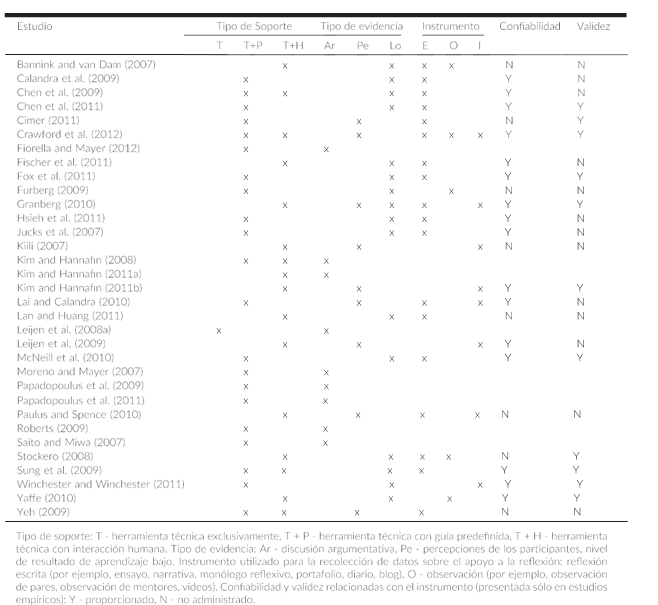 Además, se buscaron artículos que dieron evidencia empírica sobre el apoyo a la reflexión (percepción de los participantes y el nivel de resultados de aprendizaje) si los autores informaron sobre la fiabilidad y validez de su estudio en el mismo. La mayoría de los estudios proporcionaron información sobre la confiabilidad - en su mayoría había más de una persona que codificó datos (Calandra et al., 2009; Chen et al., 2009, Crawford et al., 2012; Fischer et al., 2011; Fox et al., 2011, Hsieh et al., 2011, Jucks Et al., 2007, Lai y Calandra, 2010, Leijen et al., 2009, McNeill et al., 2010, Sung et al., 2009, Winchester y Winchester, 2011).