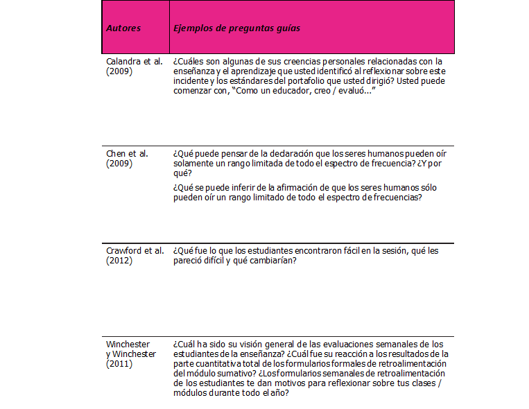 Los métodos de pregunta activan procesos reflexivos ayudando a los estudiantes a seleccionar el material más relevante y las estrategias más apropiadas (Fiorella y Mayer, 2012). Las orientaciones guían a los estudiantes a enfocarse en conceptos críticos y estrategias de resolución de problemas (Kim y Hannafin, 2008), fomentar una reflexión más profunda y proporcionar retroalimentación sobre la reflexión. Si no se le proporcionó información, los alumnos luchan por saber qué escribir, obteniendo un resultado descriptivo (Roberts, 2009) y aprenden más cuando se les pide que reflexionen sobre las respuestas correctas (Moreno y Mayer, 2007). Las preguntas orientadoras ayudaron a los participantes a tomar conocimiento y preocupación por ser visible y explícito (Yaffe, 2010). Pueden incluir preguntas y sugerencias en diferentes procesos. Por ejemplo, se pueden utilizar guías de reflexión (Cimer, 2011, Fox et al., 2011, McNeill et al., 2010, Roberts, 2009).