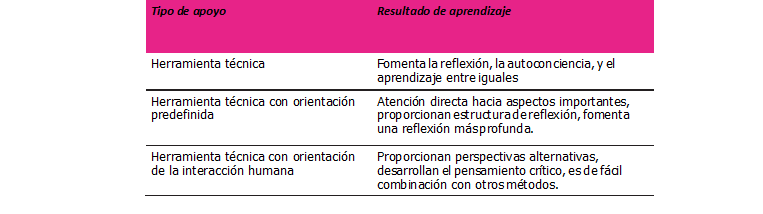 Los estudios analizados demostraron que los videos ayudan a los participantes a ser más conscientes de su proceso. Blogs y portafolios ayudaron a los participantes a mejorar las habilidades de reflexión y facilitaron la interacción con sus compañeros. Preguntas y respuestas guiadas como la orientación predefinida era más general y se usaba con frecuencia. Este tipo de apoyo dio estructura a la reflexión y animó a los participantes a considerar los materiales con más cuidado, profundizar su pensamiento y desarrollar la autorreflexión En los estudios analizados, la interacción mejoró las habilidades de pensamiento crítico y facilitó el aprendizaje desde múltiples perspectivas.