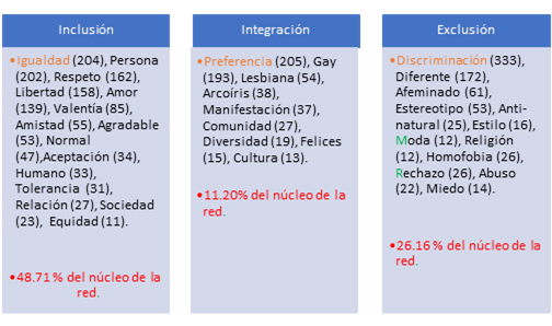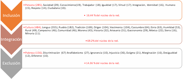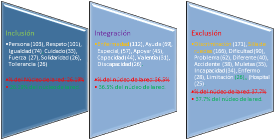 En cuanto a los resultados, se presentan en un orden general, y se señala el comportamiento de la red, para posteriormente continuar con la clasificación de las palabras con mayor peso semántico. Se agruparon en un conjunto denominado núcleo de la red, en donde se integraron las palabras más significativas para los estudiantes. Posteriormente, se continuó con la construcción de tres dimensiones teórico-analíticas, las cuales fueron: inclusión, integración y exclusiónentendidas en los términos que se refiere a continuación.