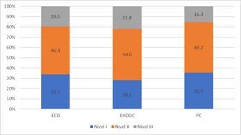 El resultado alcanzado por los docentes que buscaron ingresar al Servicio Profesional Docente (SPD) en 2017 considerando los tres exámenes comentados, no parece ser del todo favorable. Se observa en la Figura 1, que alrededor del 50% de los profesores logran el nivel II de habilitación, es decir, llegan a 100 puntos en la escala construida para la evaluación, sin embargo, también el restante 50% se decanta hacia los resultados insuficientes, en promedio una tercera parte de quienes participaron en el examen solo lograron el nivel I y quienes logran el nivel III son el menor porcentaje.