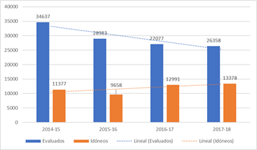 En un comparativo de los resultados generales obtenidos por los docentes de nuevo ingreso en los ciclos escolares del 2014-15 al 2017-18 se observa que las calificaciones logradas por los docentes evaluados son insuficientes; año tras año el incremento de aquellos que logran ser valorados como idóneos es tangencial, pasa de un 24.6% en el ciclo escolar 2014-15 a un 33.6% en el ciclo 2017-18, esto indica al menos dos asuntos, el primero es que los procesos formativos no están dando los resultados esperados, es decir, contar con docentes capacitados, lo que en sus conocimientos disciplinares, en sus habilidades docentes y en la planeación didáctica no se logra de manera suficiente ; el segundo es la falta de precisión del dato proporcionado por el exsubsecretario ya que solamente indica el valor idóneo (Ver Figura 2).