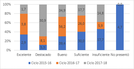 Tomando en consideración estos rubros los resultados de la evaluación a los sustentantes para los ciclos del 2015-16 al 2017-18 son deficitarios; los que no alcanzaron la calificación mínima de 1000 puntos para lograr una calificación de insuficiente son para el primer período el 17.7%; se redujo de manera significativa en el siguiente lapso al pasar al 5.9%, pero repuntó en el siguiente ciclo a 14.8%.