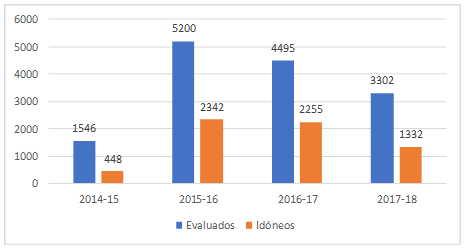 Ahora, los resultados de la evaluación que corresponden a la promoción de los docentes tampoco son alentadores, en palabras de Tuirán (2018) se plantea que: “Se ha evaluado a 14.540 docentes para obtener una promoción a funciones de dirección, de los cuales 6.377 fueron idóneos” (p. 117). Sin embargo, cabe aclarar que la información mantiene la misma falta de precisión previa al valorar a los sustentantes como idóneos si hacer los matices anteriormente comentados.