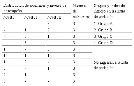 Es claro que hay diferencias importantes para ser calificado como un docente idóneo, es decir, no es lo mismo tener tres exámenes en el nivel III que encontrarse con tres exámenes en el nivel II, el primero pertenece al grupo A de prelación en tanto el segundo pertenece al grupo D, sin embargo, todos los aspirantes a ingresar a la educación media superior son docentes idóneos en la medida en que no obtengan calificación en el nivel I. De esta manera, en la Figura 2 se presentan resultados genéricos, sin que sea posible establecer el grupo donde se encuentran los docentes considerados idóneos.