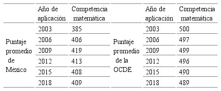 En la Tabla 1 se presentan los resultados obtenidos por los estudiantes mexicanos en PISA, también se muestra la comparación de la puntuación respecto al promedio de los países participantes. Se observó un incremento de 23 puntos entre los resultados de 2003 a 2015. No obstante, en relación a los resultados de 2009, 2012 y 2015 se presentó una disminución en el puntaje con una media de cinco puntos entre cada evaluación. Al mismo tiempo, se registró una diferencia de 80 puntos, con respecto al puntaje promedio de la OCDE, en la aplicación de 2018.