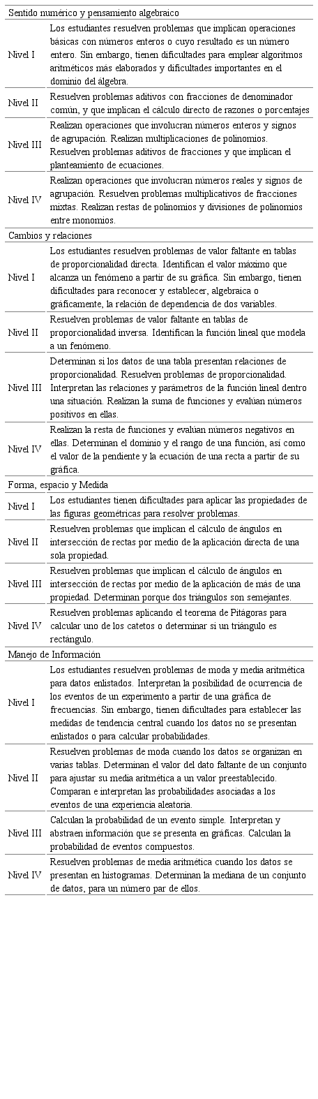 Los resultados obtenidos a través de PLANEA se agrupan en cuatro niveles de logro, lo que se traduce en los aprendizajes claves que debieron adquirir los estudiantes de manera gradual, durante su trayectoria académica en el bachillerato. Para la evaluación del logro académico en Matemáticas se consideran cuatro niveles de dominio, en la Tabla 3 se detallan las características de cada cual, al igual que los diferentes campos que se evalúan.