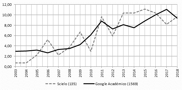 El desarrollo de literatura específica para la investigación educativa es evidente, especialmente por la forma como se ha constituido como un área autónoma en el desarrollo curricular de las instituciones educativas. Al realizar una consulta en los buscadores académicos que recopilan información sobre el tema, seleccionando aquellos documentos que presentan las palabras específicas Investigación educativa en los títulos. En la Figura 1 se presenta la información recopilada en dos buscadores académicos. Fue posible clasificar con estos requerimientos 135 documentos en el buscador Scientific Electronic Library Online (Scielo.org), de estos datos se puede evidenciar una tendencia de crecimiento de 0,68 unidades porcentuales por cada año (r.=0,7570). En la base de datos de Google Académico (Google Scholar) aparece un total de 1569 documentos, entre libros y artículos, en donde aparece una tendencia de crecimiento similar a la anterior, de 0,58 unidades porcentuales por cada año (r.=0,8857). En ese sentido, es posible identificar que, a lo largo del presente siglo, existe una tendencia importante de crecimiento e interés sobre el tema, por lo menos en lo que respecta al tema principal de la literatura consultada.