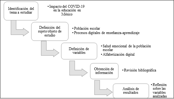 Bajo este contexto, el sujeto de estudio sobre el cual está centrada el análisis de la reflexión es la comunidad estudiantil en los diferentes niveles educativos y el objeto de estudio está enfocado hacia los procesos y las técnicas de enseñanza digital para la transmisión del conocimiento. Las etapas sobre las cuales se realizó el trabajo se presentan en la figura 1.