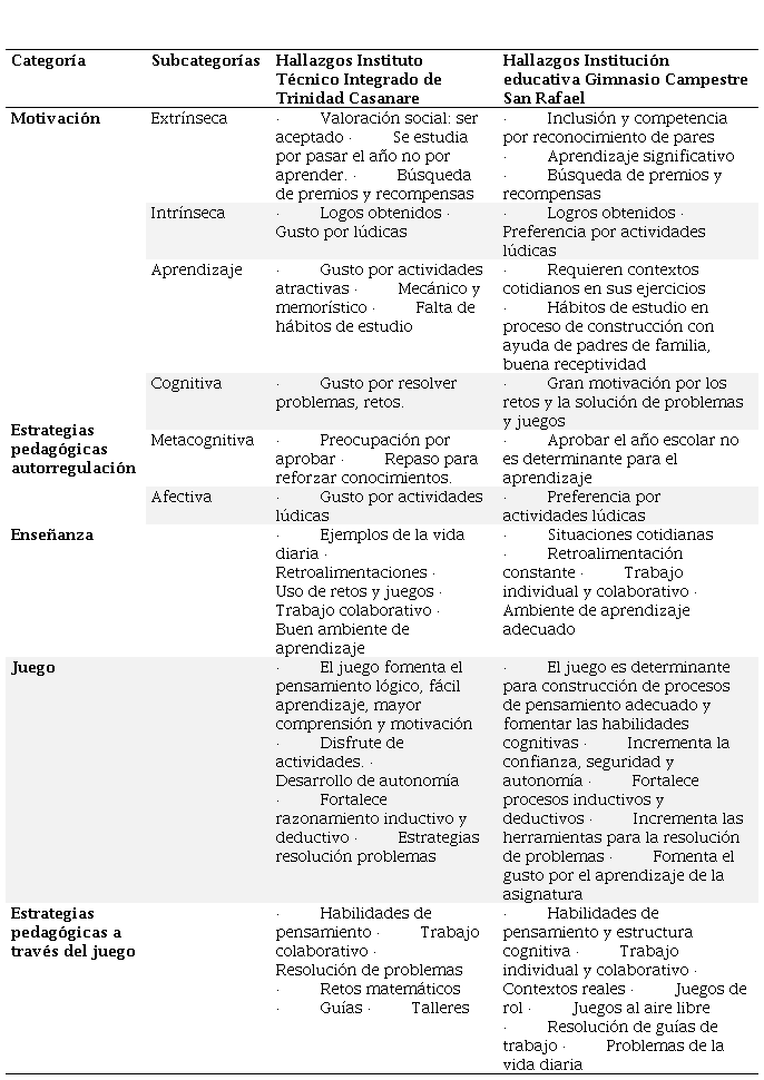 Se concluye que para la motivación extrínseca lo más relevante en ambas instituciones es que los estudiantes valoran el ser aceptados, disfrutan la competencia entre pares, las recompensas usadas para la motivación y las actividades lúdicas, que ven como recompensa. En la institución pública las motivaciones son influenciadas por padres y docentes y no por sus gustos o metas, mientras que en la institución privada la mayor motivación surge del enfrentarse a sí mismos y los retos de la asignatura. En las dos instituciones los estudiantes necesitan refuerzos afectivos constantes, confianza y acompañamiento lo que es relevante para procesos de autorregulación