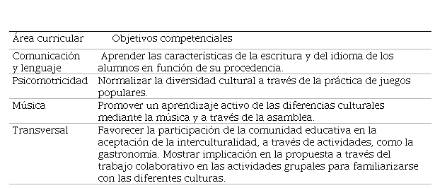 La etapa de Educación Infantil se caracteriza por la corta edad del alumnado, por tanto, para trabajar la interculturalidad en las aulas con estos alumnos se debe tener en cuenta esta circunstancia y adaptar las actividades al periodo evolutivo de los alumnos. Desde un punto de vista conceptual, sobre la base teórica expuesta anteriormente, se diseñó el proyecto implementado que se caracteriza por abordar la interculturalidad de forma interactiva, mediante la realización de talleres y actividades lúdicas. Los objetivos que se trabajan desde la propuesta de intervención son de tipo competencial, específicos para cada área y se muestran en la tabla 1.